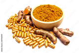 Raw Turmeric (Curcuma longa Linn) herbal,curcuma powder in wooden cup and turmeric capsules isolated on white Background.