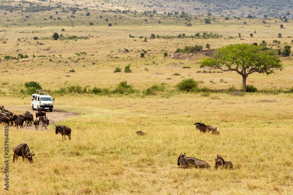 Safari concept. Safari car with wildebeests in african savannah. Masai Mara national park, Kenya.