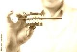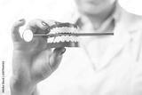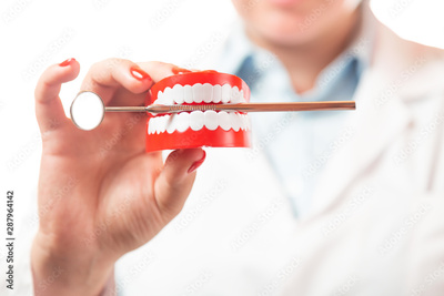 Dental health and teethcare concept. Dentist holding human jaw model with dental mirror.