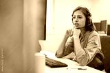 Beautiful young call centre telephone worker talking with a client while sitting bellow computer. Copy space on left side.