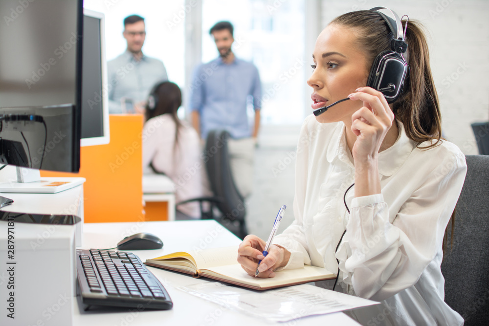 Beautiful young customer support female operator talking with client via hands-free headphones with microphone and writing notes to notebook in call center