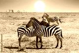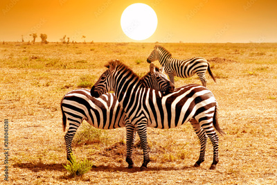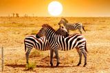 Wild nature landscape. Zebra at amazing sunset in Masai Mara National Park, Kenya. African savannah.
