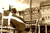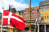 Copenhagen iconic view. Famous old Nyhavn port in the center of Copenhagen, Denmark during summer sunny day with Denmark flag on the foreground.