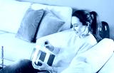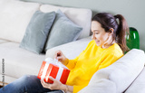 Woman opening her gift at home.