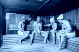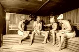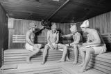 close up photo of 4 men resting in russian sauna using oak brooms
