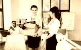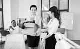 business, new job and corporate concept - female employee with personal stuff and colleagues at office
