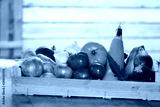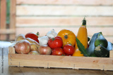 Cagette de légumes d'été : tomages, courgettes, oignons... sur fond bois