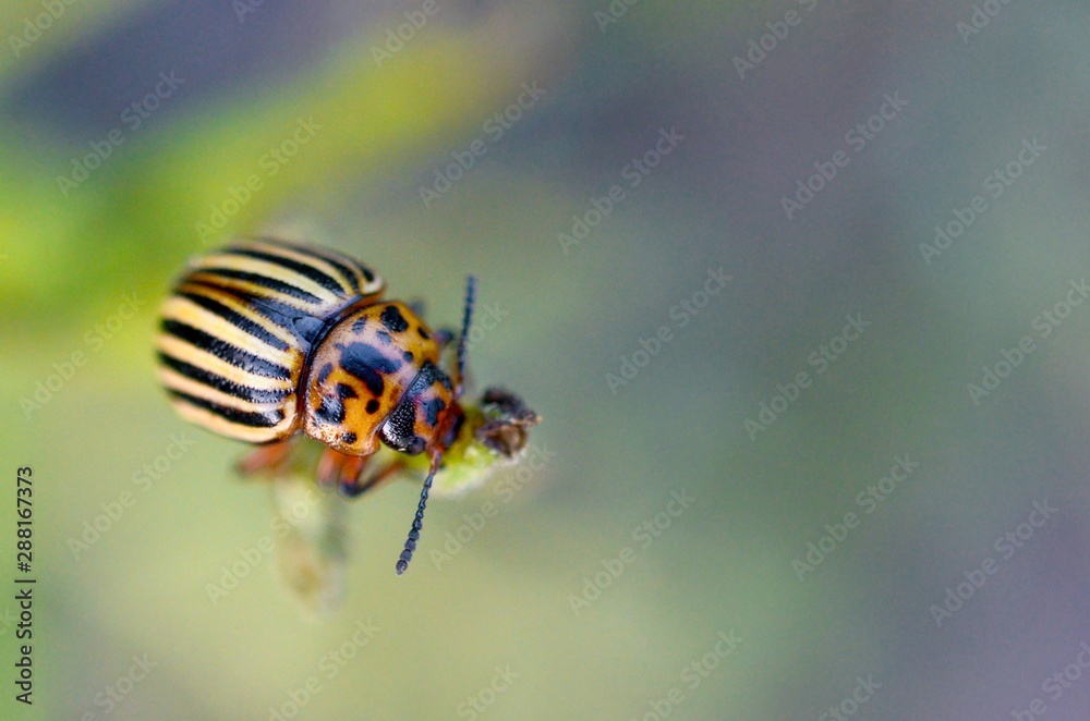 Colorado potato beetle Leptinotarsa decemlineata crawling on potato leaves
