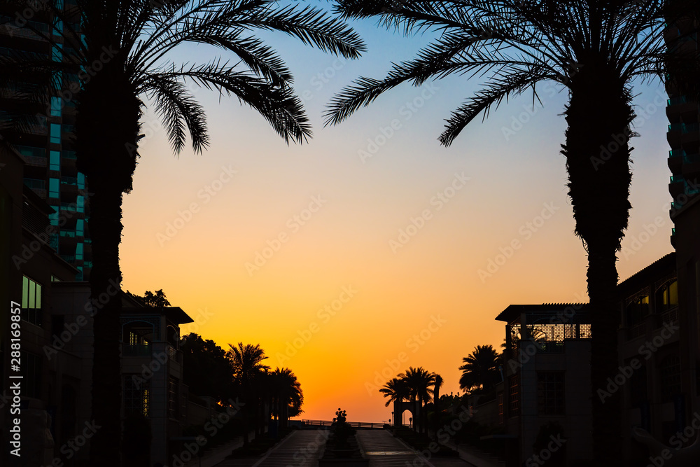 Tropical Palm Trees Silhouettes during sunset. Travel background. Dubai, United Arab Emirates
