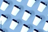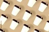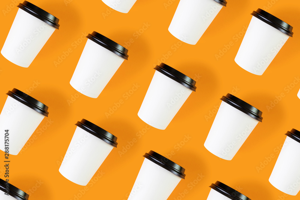 Bright effective background from white paper coffee cups with black lids on a saturated orange background. Pattern. Minimalism, flat lay, top view, design. Copy space
