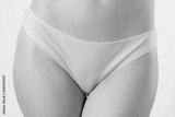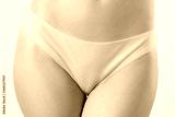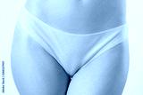 Front view flesh-colored beige panties. Close up Woman in blank template underwear mock up with copy space. Laser Hair Removal and shaving bikini line concept. Beauty summer treatment for female body.