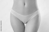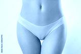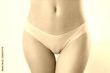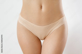 Front view flesh-colored beige panties. Close up Woman in blank template underwear mock up with copy space. Laser Hair Removal and shaving bikini line concept. Beauty summer treatment for female body.