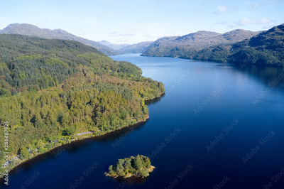 Loch Lomond aerial birdseye view from above showing islands in the Highlands Scotland UK