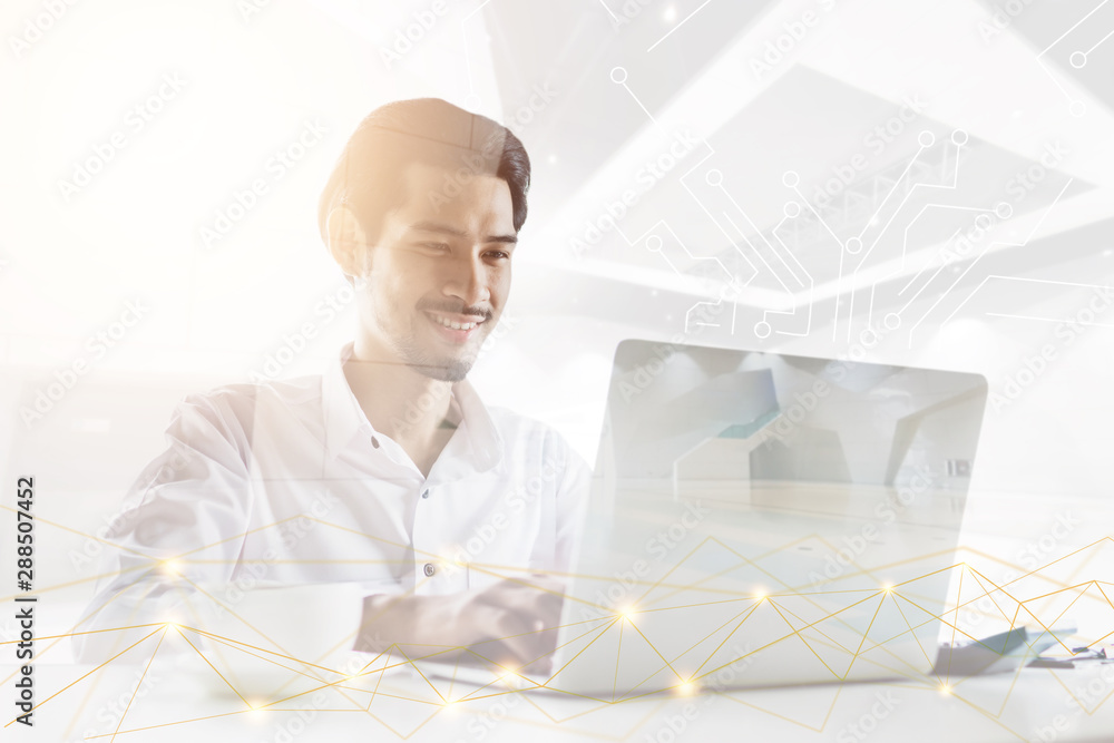 Happy smiled Asian businessman with beard and mustache working on computer chats in social networks, keyboards on laptop, reads news on websites, makes payment online with cup of coffee