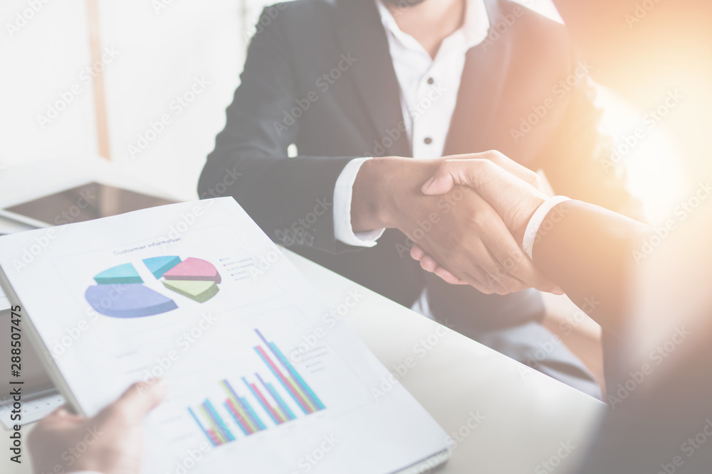 Successful financial business, businessman holding graph reports and shake hands with lead generator manager, teamwork of accountants in office