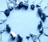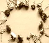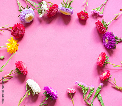 Bright Autumn flowers frame on the purple background. Top view border. Copy space