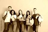 Group of students showing thumb-up gesture on color background