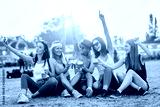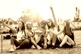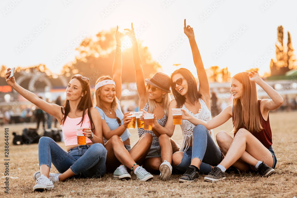Female friends drinking beer and taking selfie at music festival