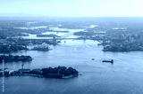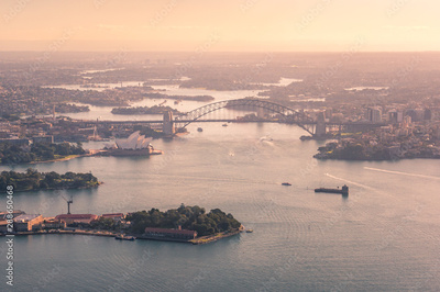 Aerial view of Sydney Harbour with Bridge and waterfront historic suburbs