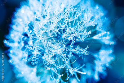 Beautiful artistic fantastic nature. Drops of water on a dandelion flower. Amazing bright blue toned image.