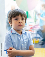 Portrait upset little boy standing alone and start crying at birthday party, Unhappy Caucasian 6 year old child at the party, Lonely kid with bored face, Jealous children concept.