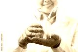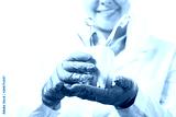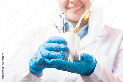 Oral dental hygiene. Healthy white tooth model, toothbrush and dentist mirror with explorer probe instrument in smiling female dentist doctor hands.