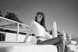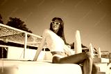 Beautiful brunette girl in swimwear and colorful sunglasses dreamily sunbathing on beach bed
