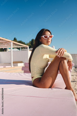 Beautiful stylish brunette girl in swimwear and colorful sunglasses dreamily looking in camera on beach bed