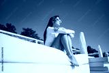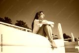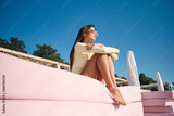 Beautiful romantic brunette girl in swimwear and colorful sunglasses dreamily resting on beach bed