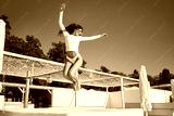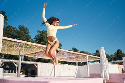 Attractive joyful brunette girl in swimwear and colorful eyeglasses happily jumping on beach bed over the sky