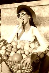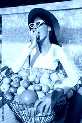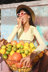 Beautiful brunette girl in hat and colorful sunglasses biting lemon while sitting with basket full of citrus on beach over colorful shiny background