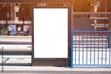 Mockup of a blank empty white advertising urban billboard, placeholder template at city tram stop, space for design layout.