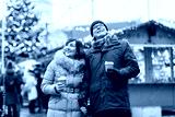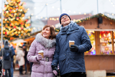 love, winter holidays and people concept - happy senior couple with takeaway coffee at christmas market on town hall square in tallinn, estonia