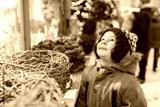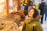 holidays, childhood and people concept - happy little boy at christmas market in winter evening
