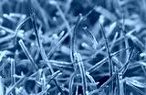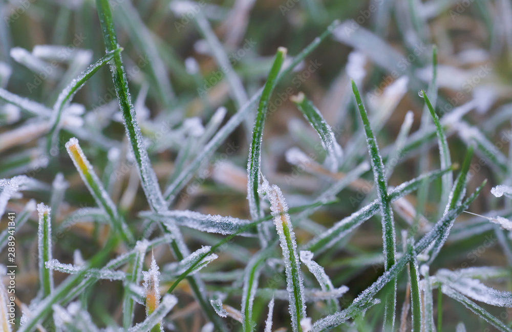 Close up photo of frosty on grass at the garden in morning, Selective focus of ice covering on meadow in a cold morning on winter