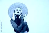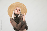 Portrait of sensual blonde girl in black transparent blouse and straw hat isolated white background copyspace