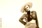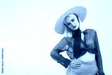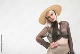 Pretty blonde in transparent blouse and straw hat posing with her hand on waist isolated white background copyspace