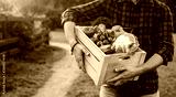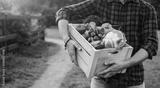 wooden box with fresh farm vegetables close up in men's hands outdoors.