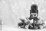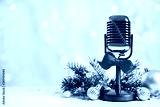 Microphone with red bow and decorations on white table against blurred lights, space for text. Christmas music