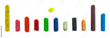 Oil crayons top view isolated on white background. Used colorful oil pastels.