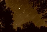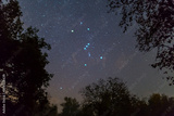 Orion constellation on the night starry sky between dark tree silhouette, outdoor night forest landscape