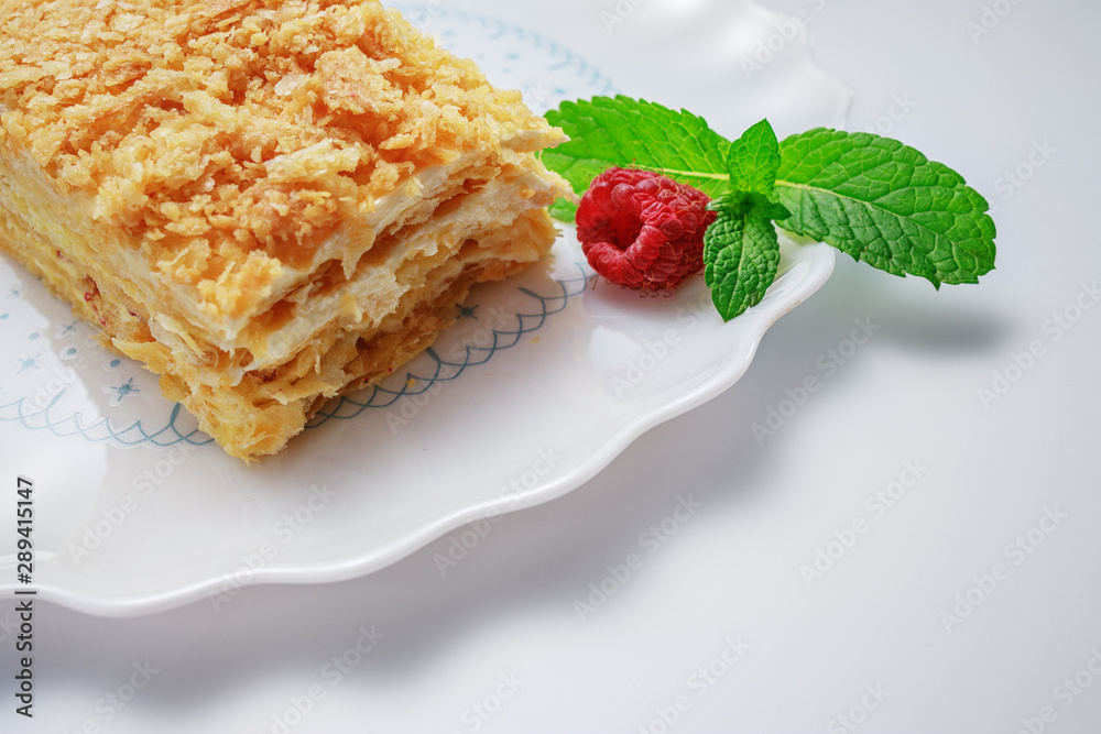 Napoleon cake with vanilla milk cream on a plate isolated on white background