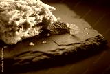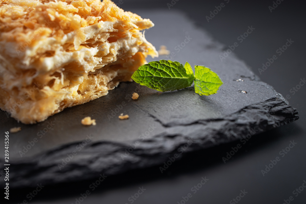 Cake Napoleon with vanilla milk cream on a stone plate isolated over black background