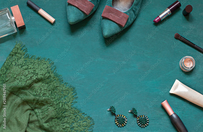 Fashion flat lay on the wooden turquoise background with cosmetics, shoes and dress. Top view concept frame. Copy space