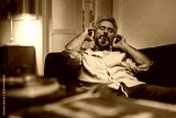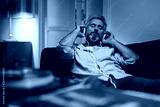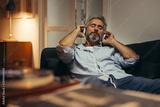 mid aged man listening music with headphones on phonograph, relaxed in sofa at his home