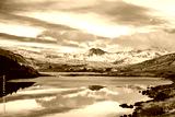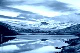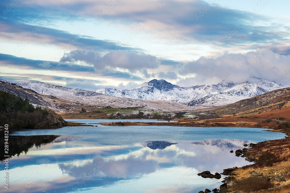 Snow covered mountain range and blue lakes in snowdonia, wales, United Kingdom.