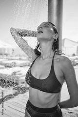Beautiful sexy brunette girl in swimsuit sensually taking beach shower on a hot day