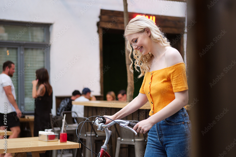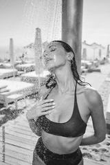 Beautiful sexy brunette girl in swimsuit dreamily taking beach shower on a hot day