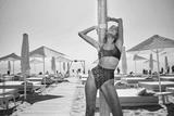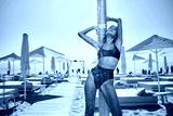 Gorgeous sexy brunette girl in swimsuit sensually standing under water drops on a hot day on beach