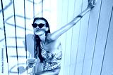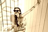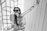 Beautiful brunette girl in one-piece swimsuit and sunglasses with cocktail posing over wood background on beach